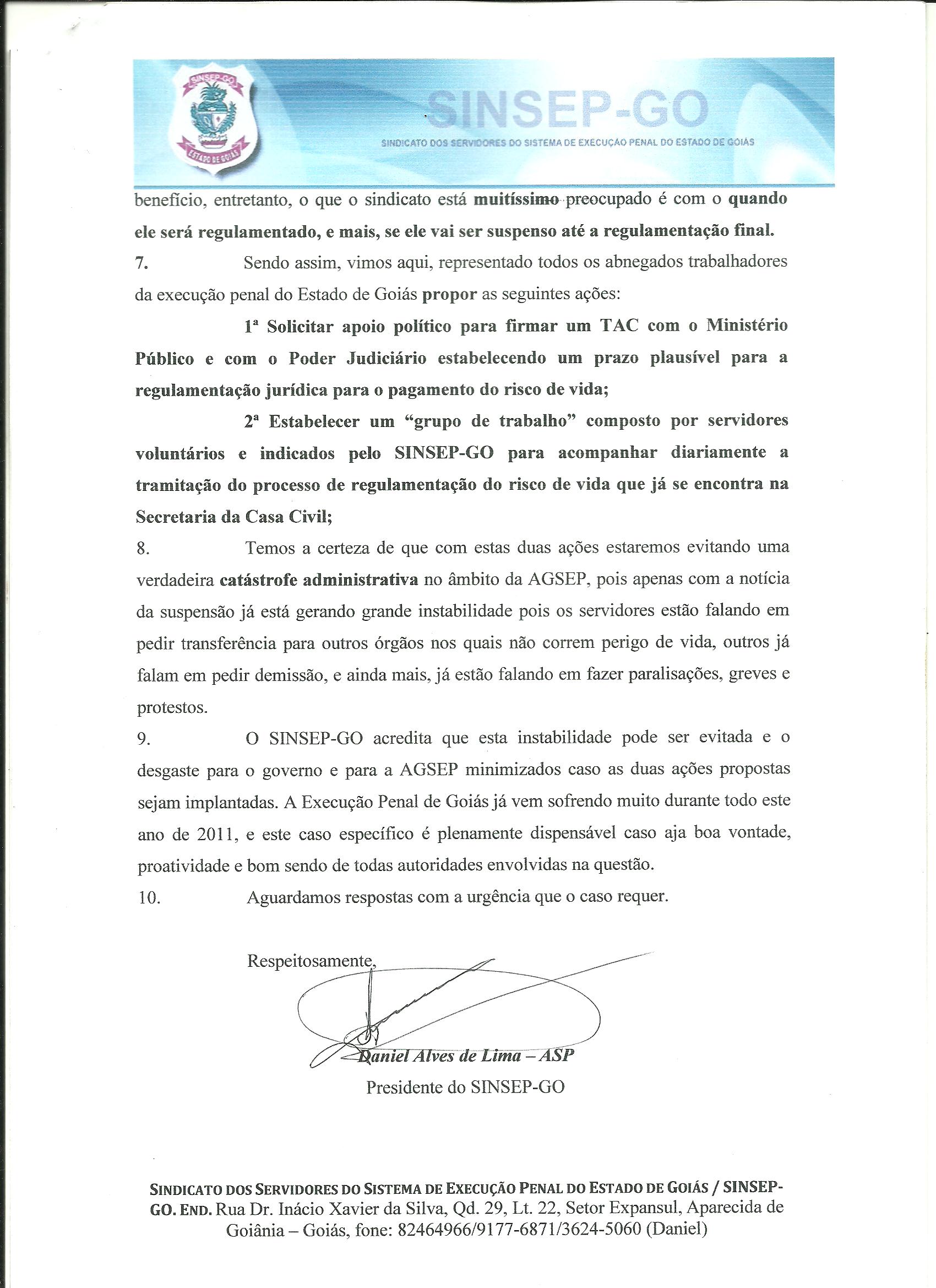 Início/O Sinsep entrou com processo no dia 08/Agosto/2011, e endereçou ao Governador Marconi Perilo, todos os secretários pertinentes e a todos os 41 deputados estaduais pedindo agilidade na regularização do risco de vida dos servidores! /Oficio 051 2011 SOLICITAÇÃO AGILIDADE NO PAG. RISCO DE VIDA 2 Oficio 051 2011 SOLICITAÇÃO AGILIDADE NO PAG. RISCO DE VIDA 2